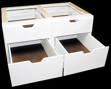 Description: Custom made drawers designed to fit underneath a basement staircase for toy storage.